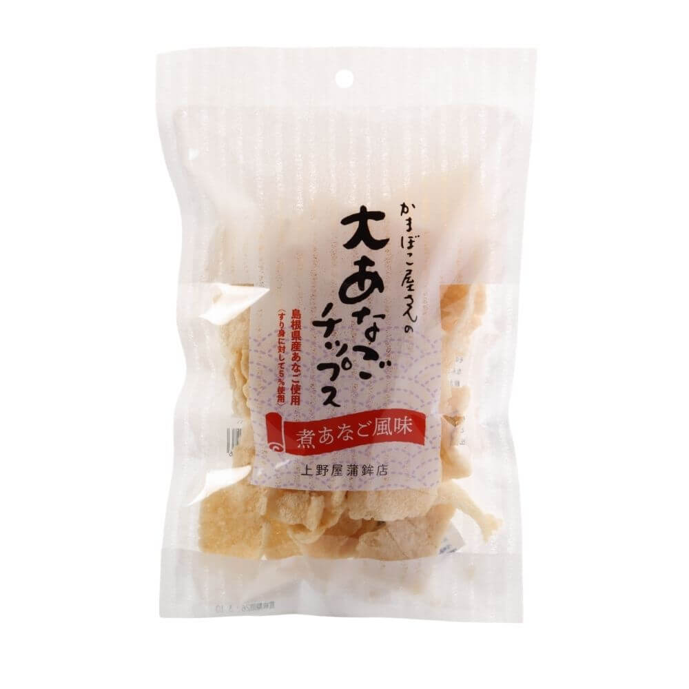 島根県大田市で水揚げされる“大あなご”を使用し、上野屋蒲鉾店が試作を重ねて生み出した和風お魚チップスです。 大あなごの旨みを引き立てた「煮あなご風味」で、ふんわり香ばしく、サクッとした軽い食感が特徴。 おやつはもちろん、お茶請けやおつまみとしても楽しめる、年齢問わず人気の商品です。